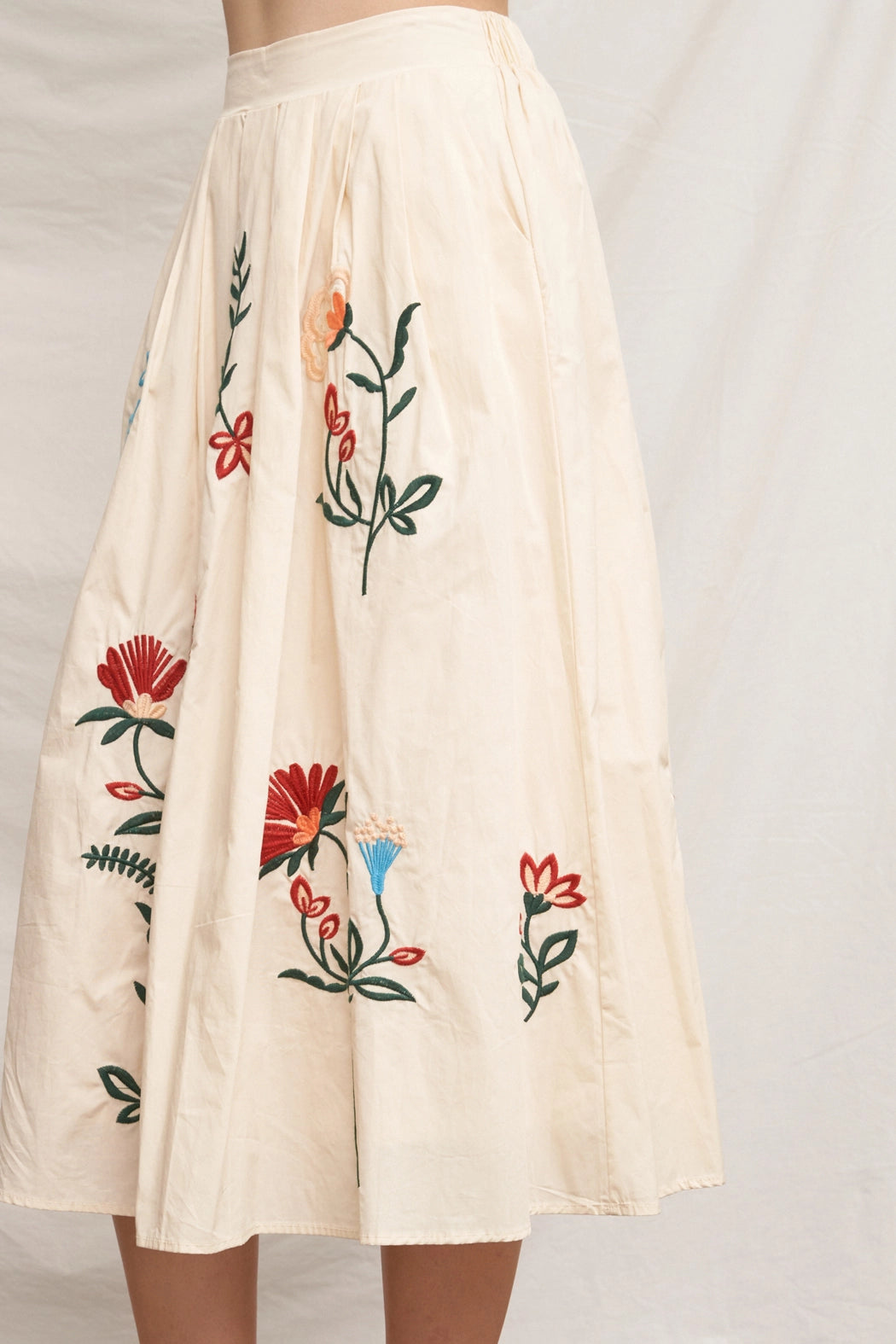 Ivory Cotton Floral Embroidered Midi Pleated Skirt