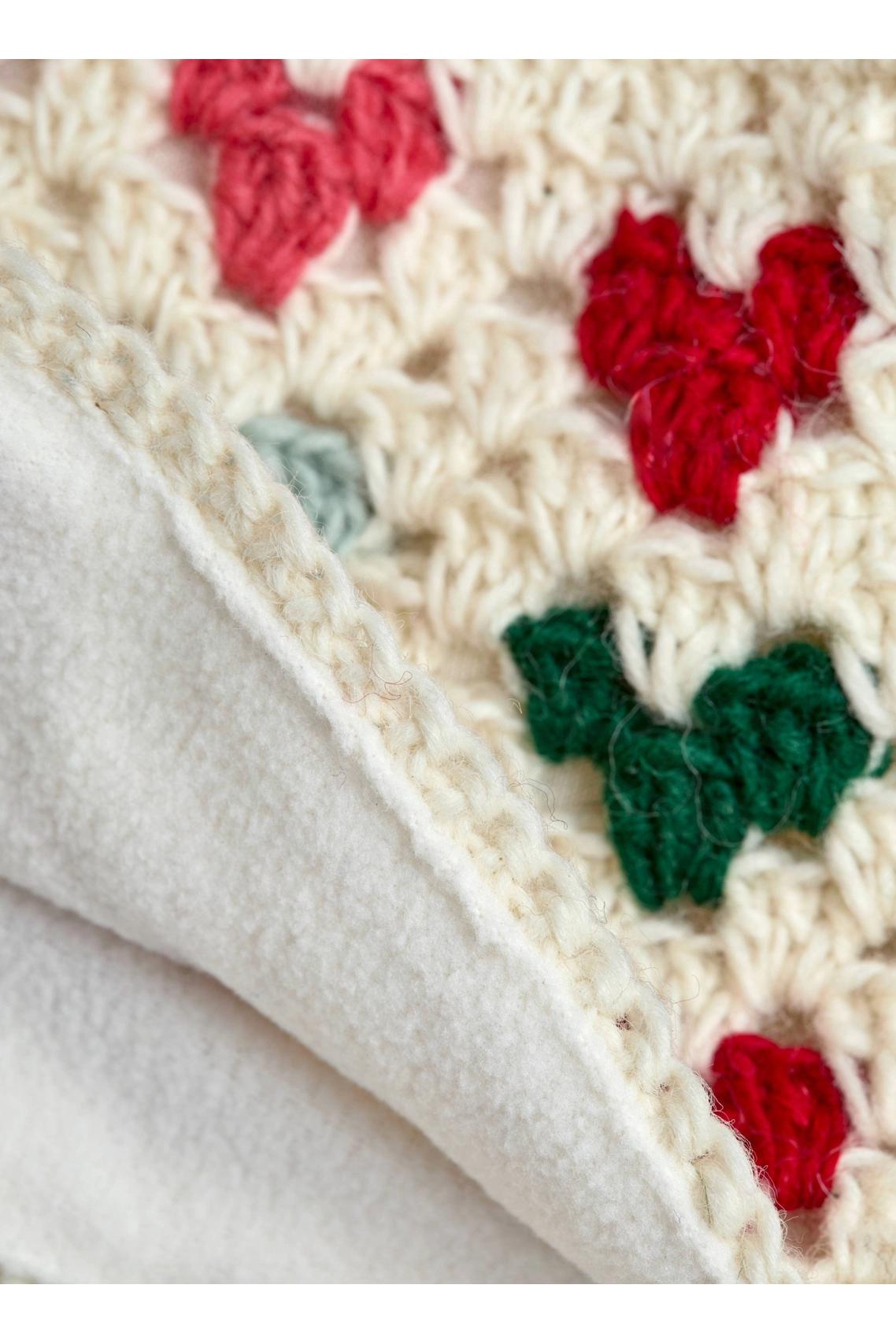 Crocheted in soft yarn with rows of bright, berry-colored hearts, these fleece-lined fingerless gloves bring warmth, color, and handcrafted charm to cold days.