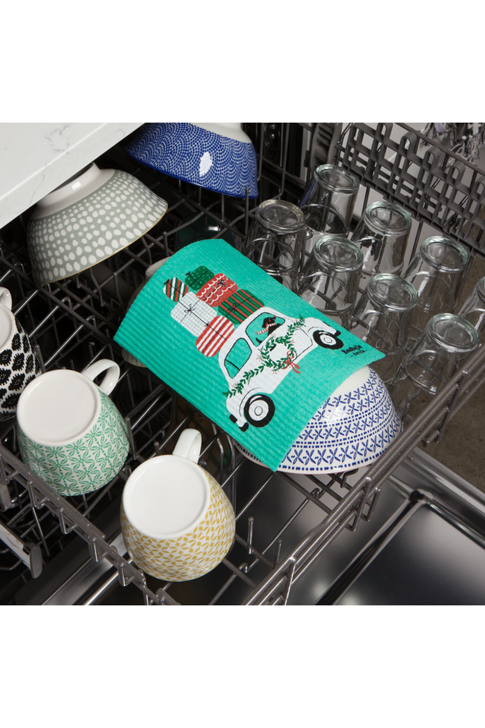 An excited pup at the wheel on this Winter Wheels dishcloth helps you motor through your cleaning list as you prepare your home for holiday guests.