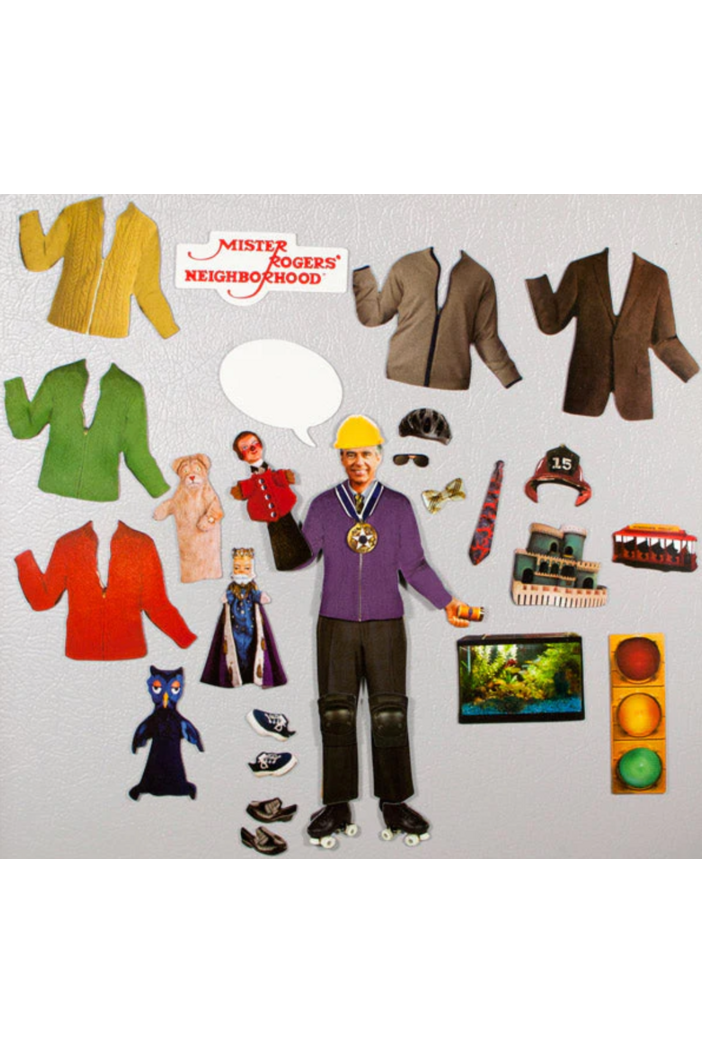 Hello, Neighbor! Mister Rogers’ mix-and-match magnetic wardrobe features a variety of outfits (and cardigans!), puppet friends, and the Neighborhood Trolley.
