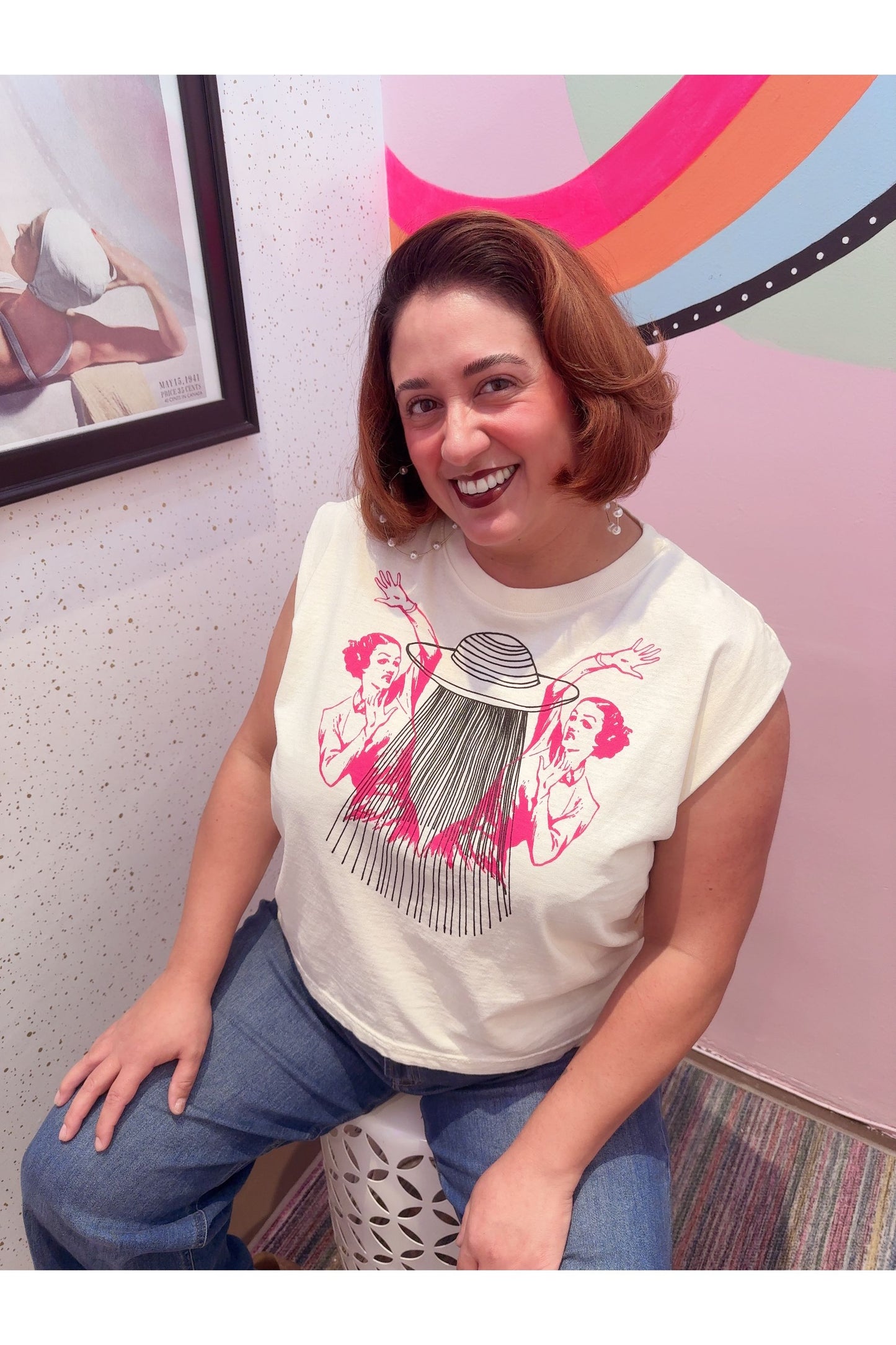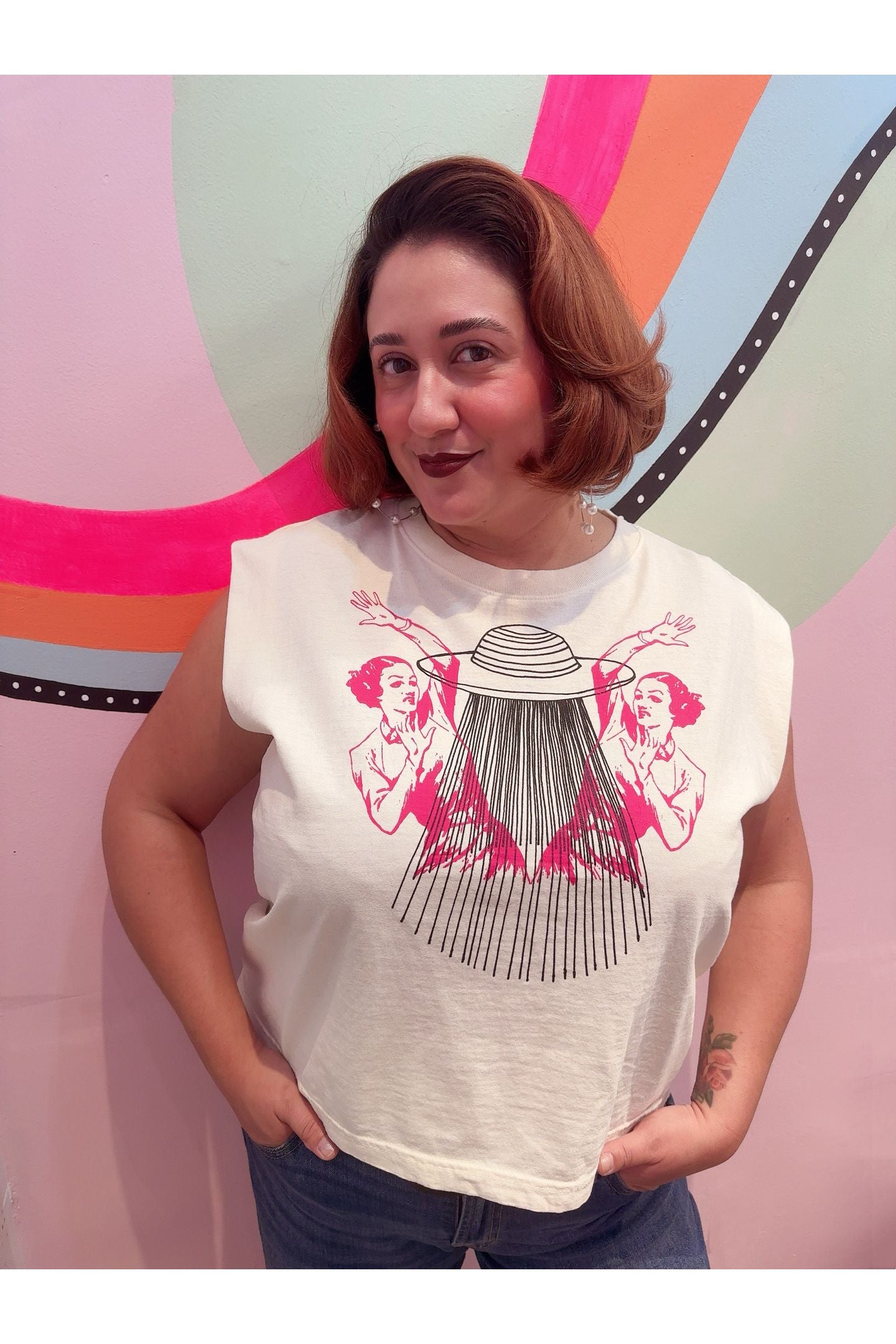 UFO muscle tee with structured shoulders and a boxy fit. Slightly cropped. Hand printed 100% garment dyed cotton.