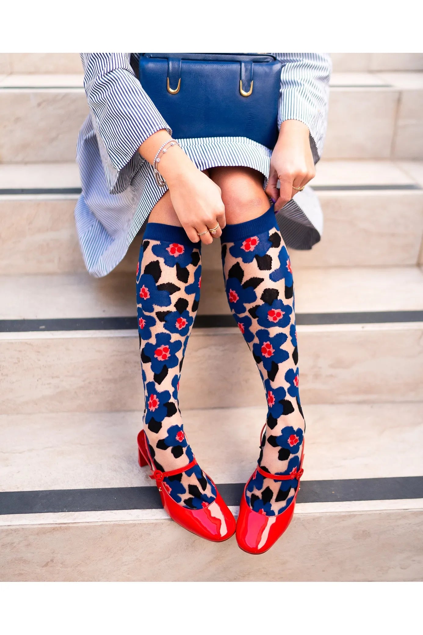 Bold Blue Floral Sheer Knee High Fashion Socks