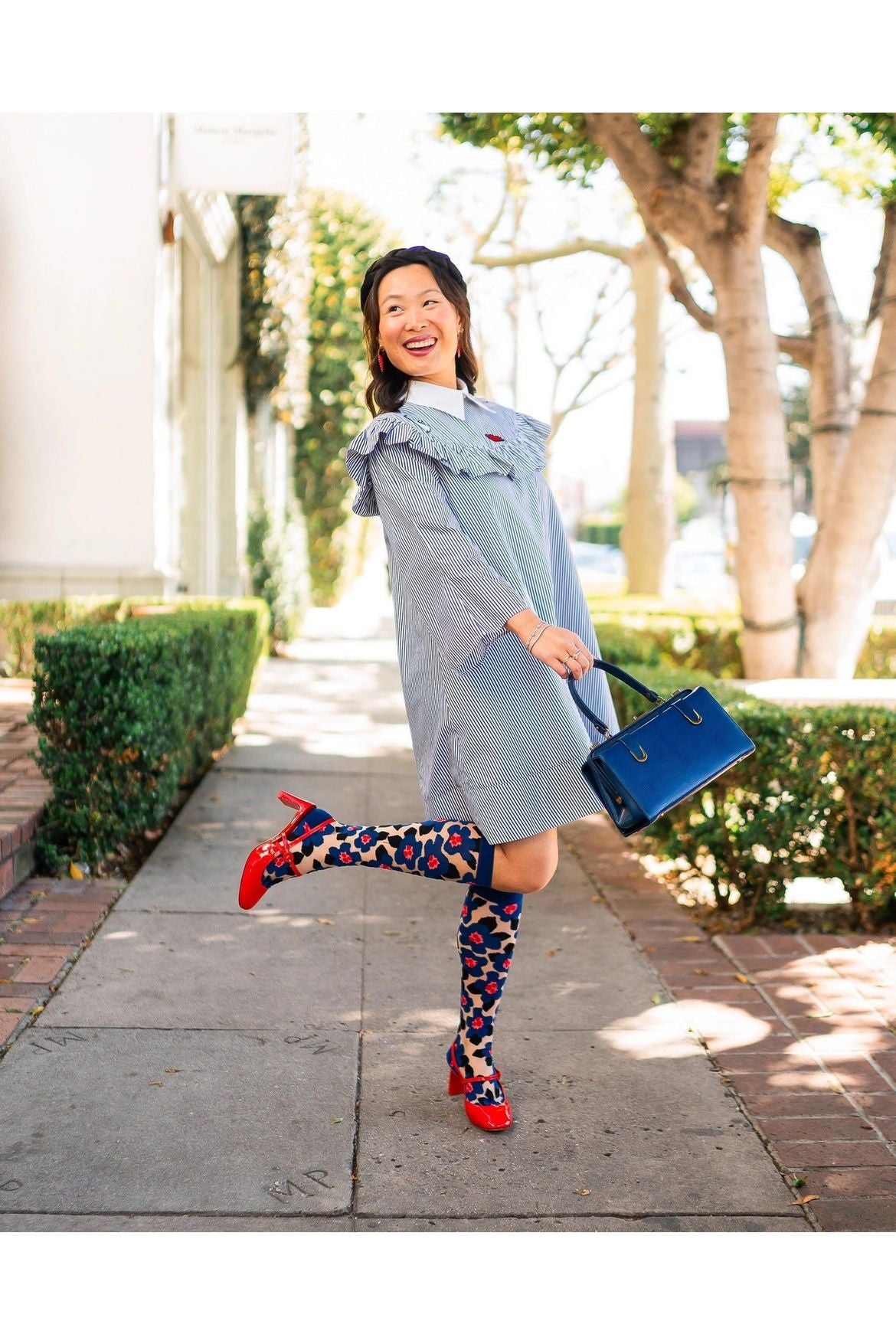 Our bestselling Bold Blue sheer sock is now available in knee high length! Bold blue florals with pops of pink and red go all the way up the leg, making this style perfect for paring with a miniskirt or dress for a preppy look. Reinforced with a cotton toe, heel and cuff for long-lasting wearability.