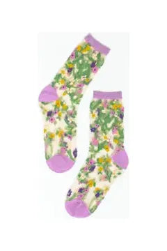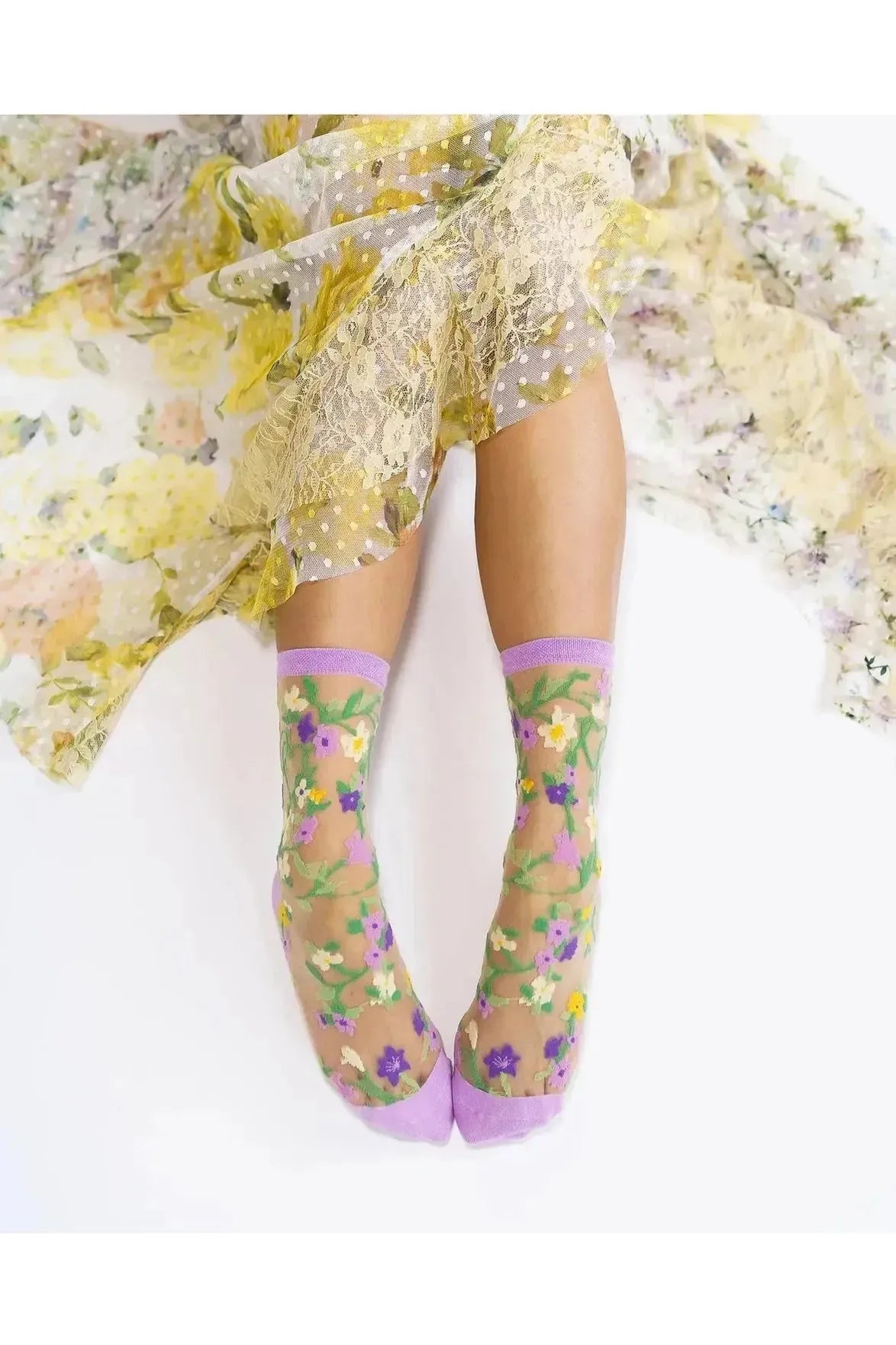 Pretty little hearts. Delicate lavender and yellow florals are set on green vines to form two intertwined hearts at the ankle. Perfect for pairing with floral dresses, add a soft romantic touch to your looks for Spring and Summer. Finished with a lavender cuff and ankle for an extra feminine vibe.