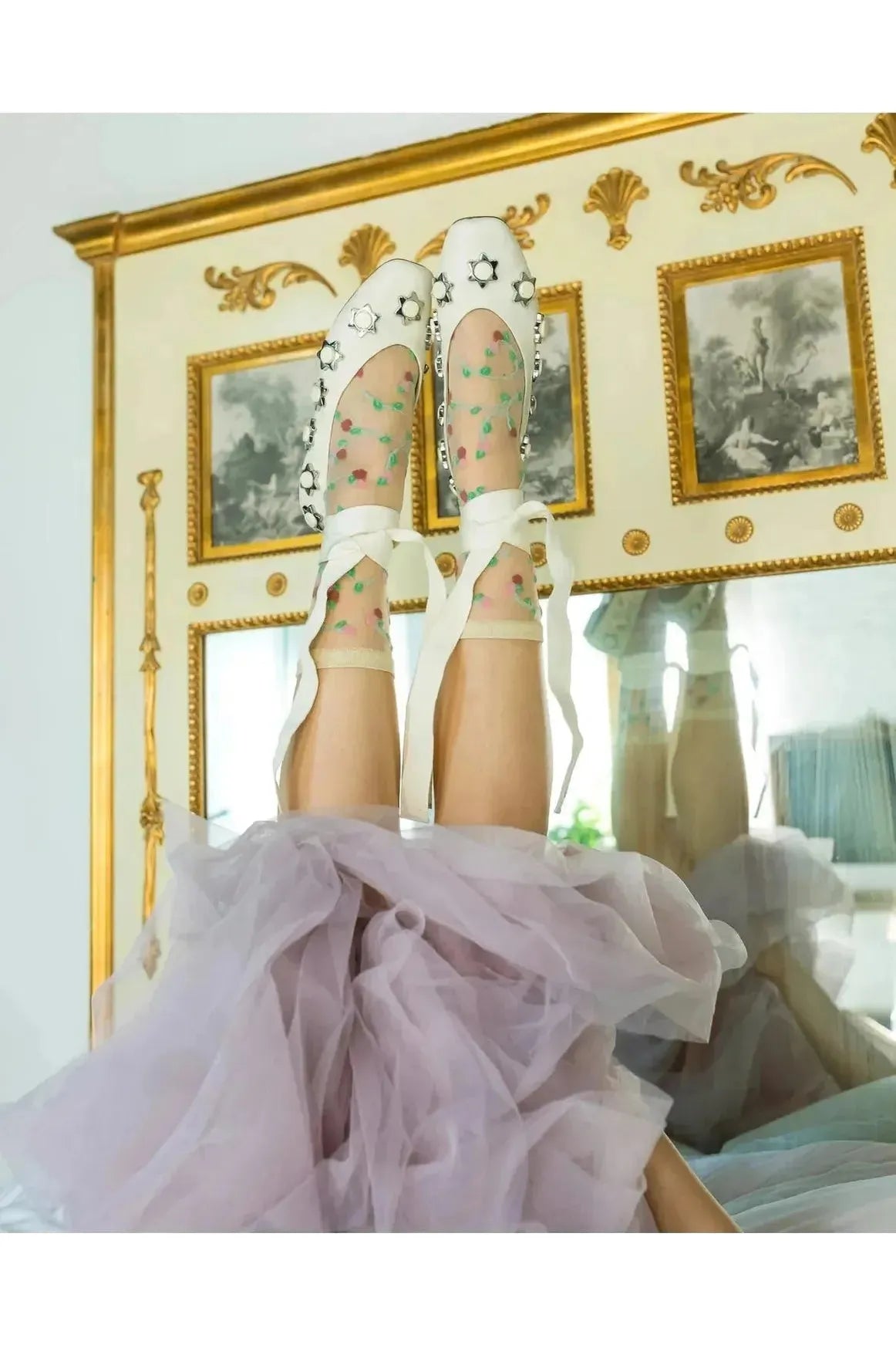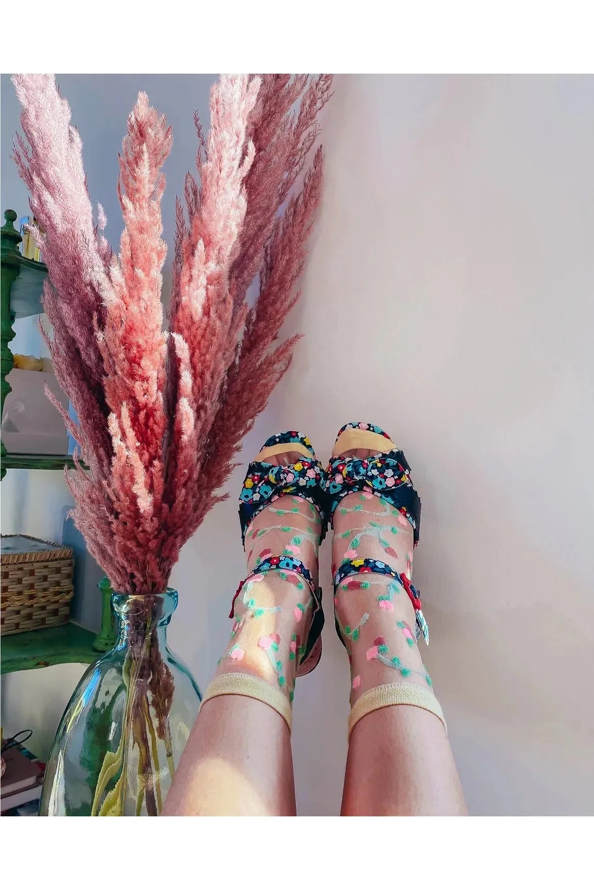 Inspired by Marie Antoinette, small pink rosettes grow on delicate green vines for an organically feminine feel. This sheer floral sock sits slightly higher on the ankle and goes perfectly with midi skirts.