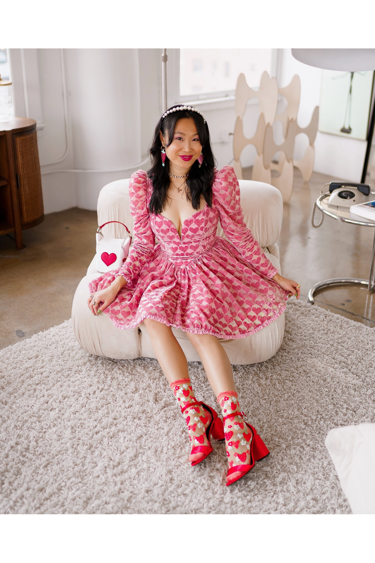 Heart-shaped pink and red strawberries interspersed with playful daisies make this sock the perfect addition to your Valentine's Day, Spring, and Summer outfits. Set against white sheer fabric for maximum color pop with a ruffle cuff for ultra sweetness.