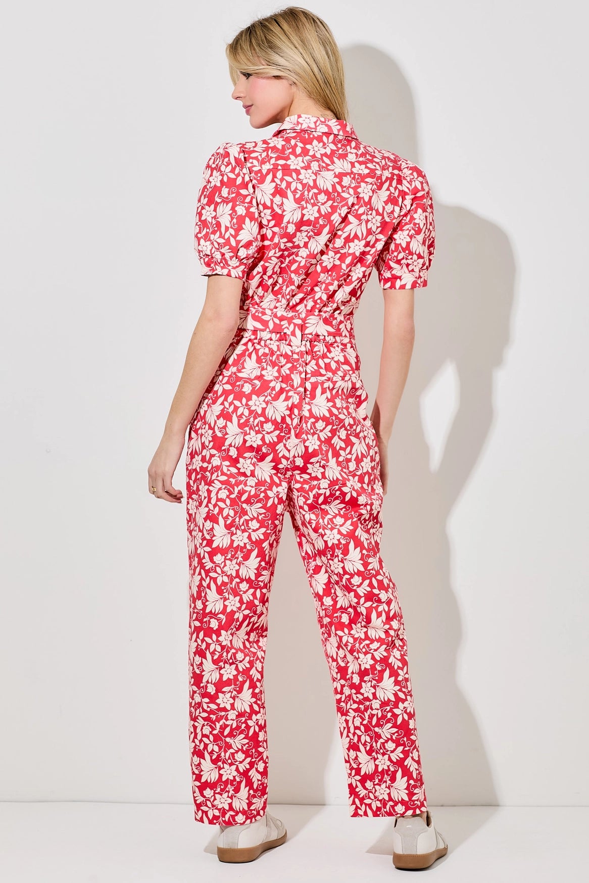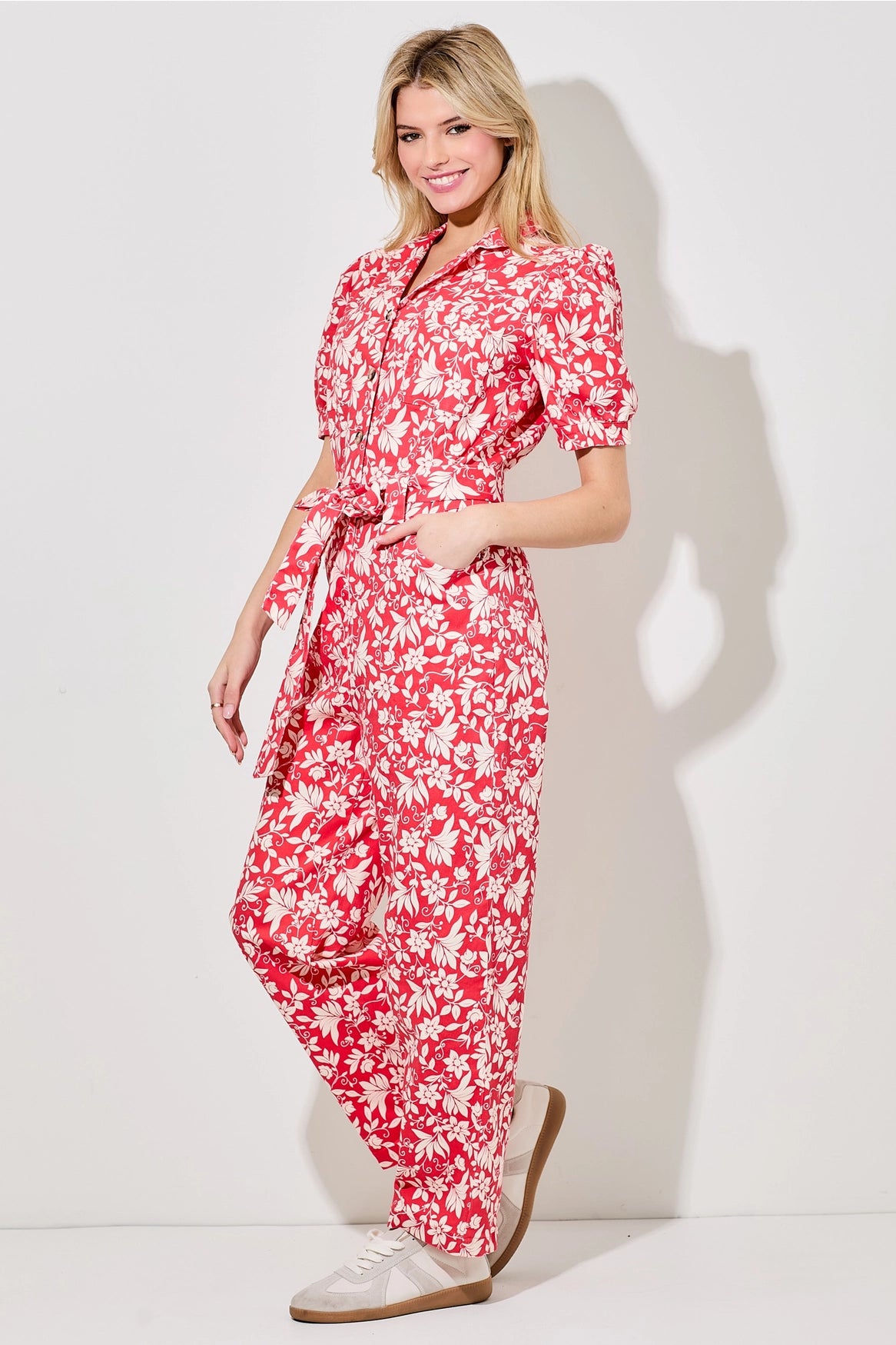 This casual, everyday jumpsuit features a charming floral print, perfect for spring and summer.