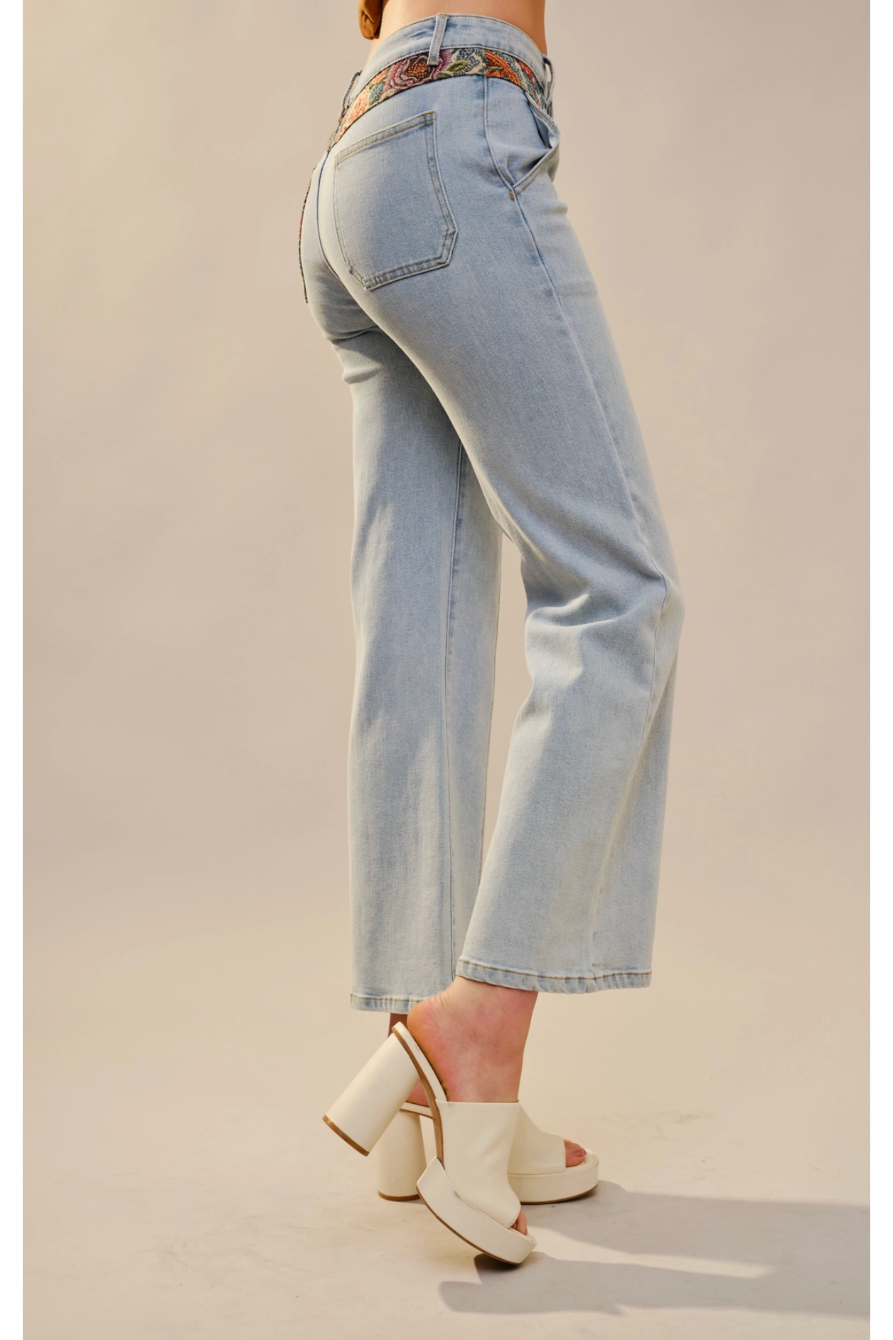 *Tapestry styled floral contrast panels along the waistband and back pocket