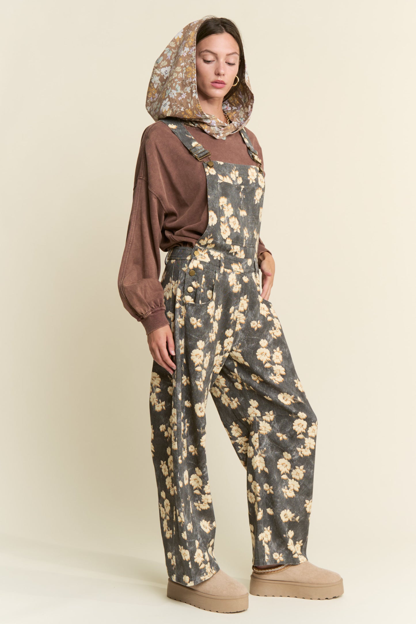 Heather Grey Barrel Wide Leg Floral Denim Overalls
