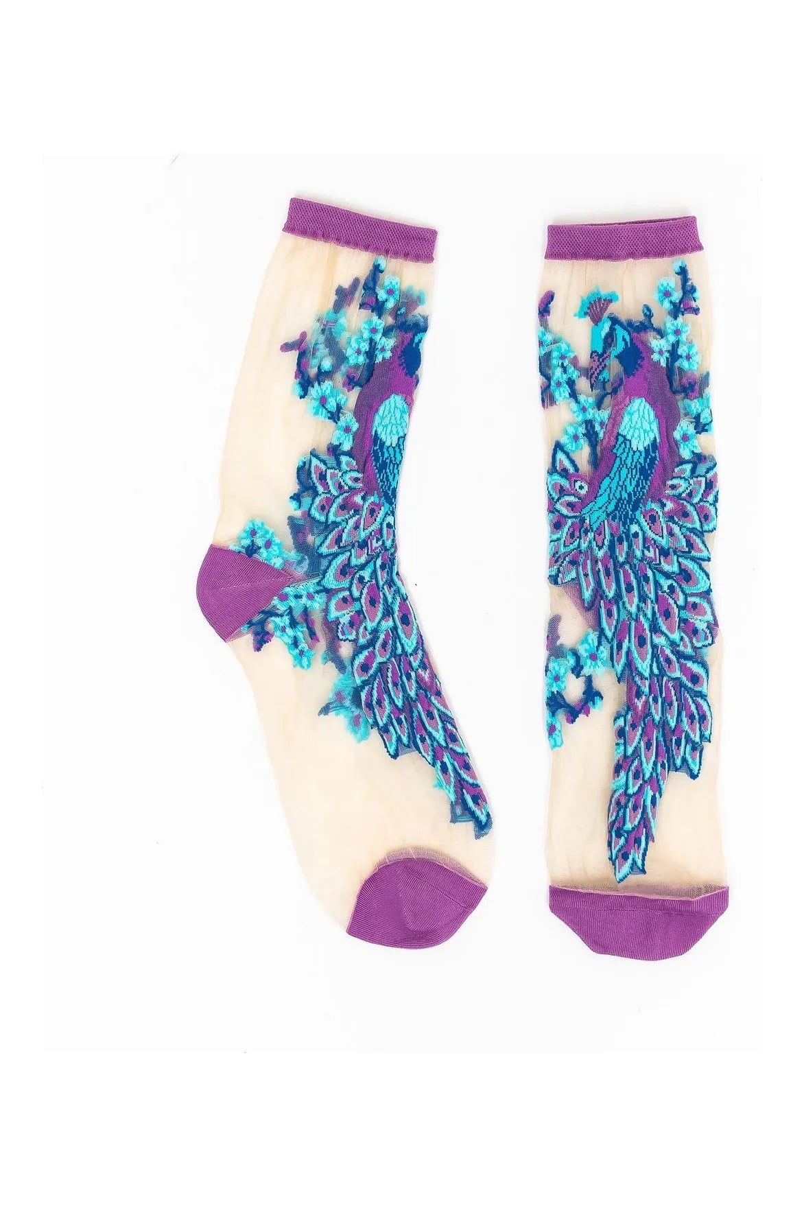 Aquamarine Peacock Sheer Crew Fashion Socks